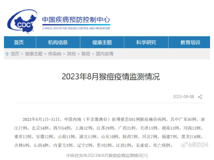 9月8日,中疾控發(fā)布8月猴痘疫情監(jiān)測情況[1]。2023年8月1日-31日,中國內地(不含港澳臺)新增報告501例猴痘確診病例,相較7月增加10例。